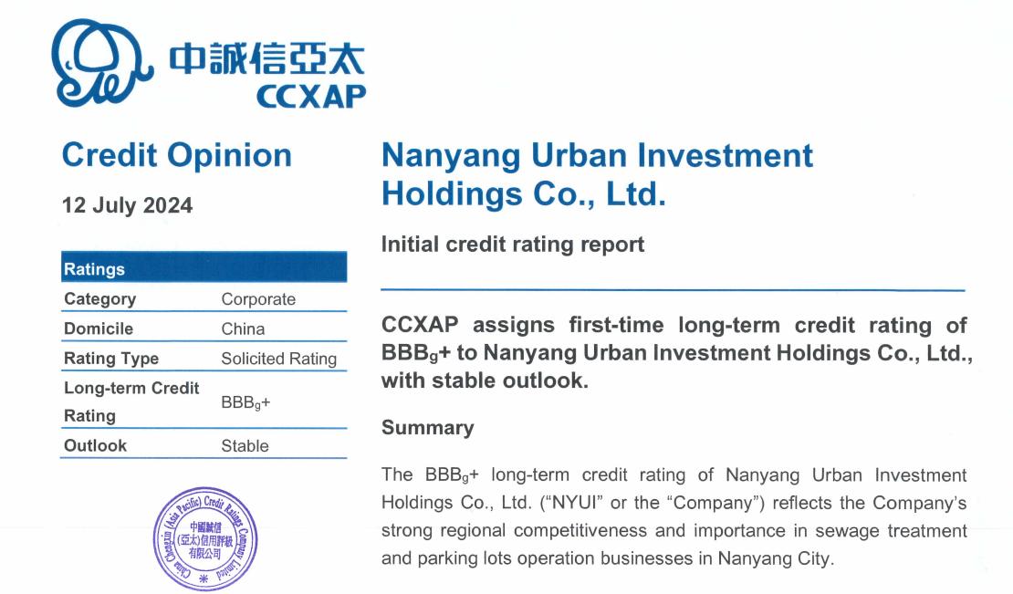 2024年7月12日,境外權(quán)威國際信用評級機構(gòu)中國誠信(亞太)信用評級有限公司(以下簡稱:中誠信亞太)首次授予南陽城投控股有限公司(以下簡稱:南陽城投控股)“BBBg+”國際長期發(fā)行人評級,展望穩(wěn)定。